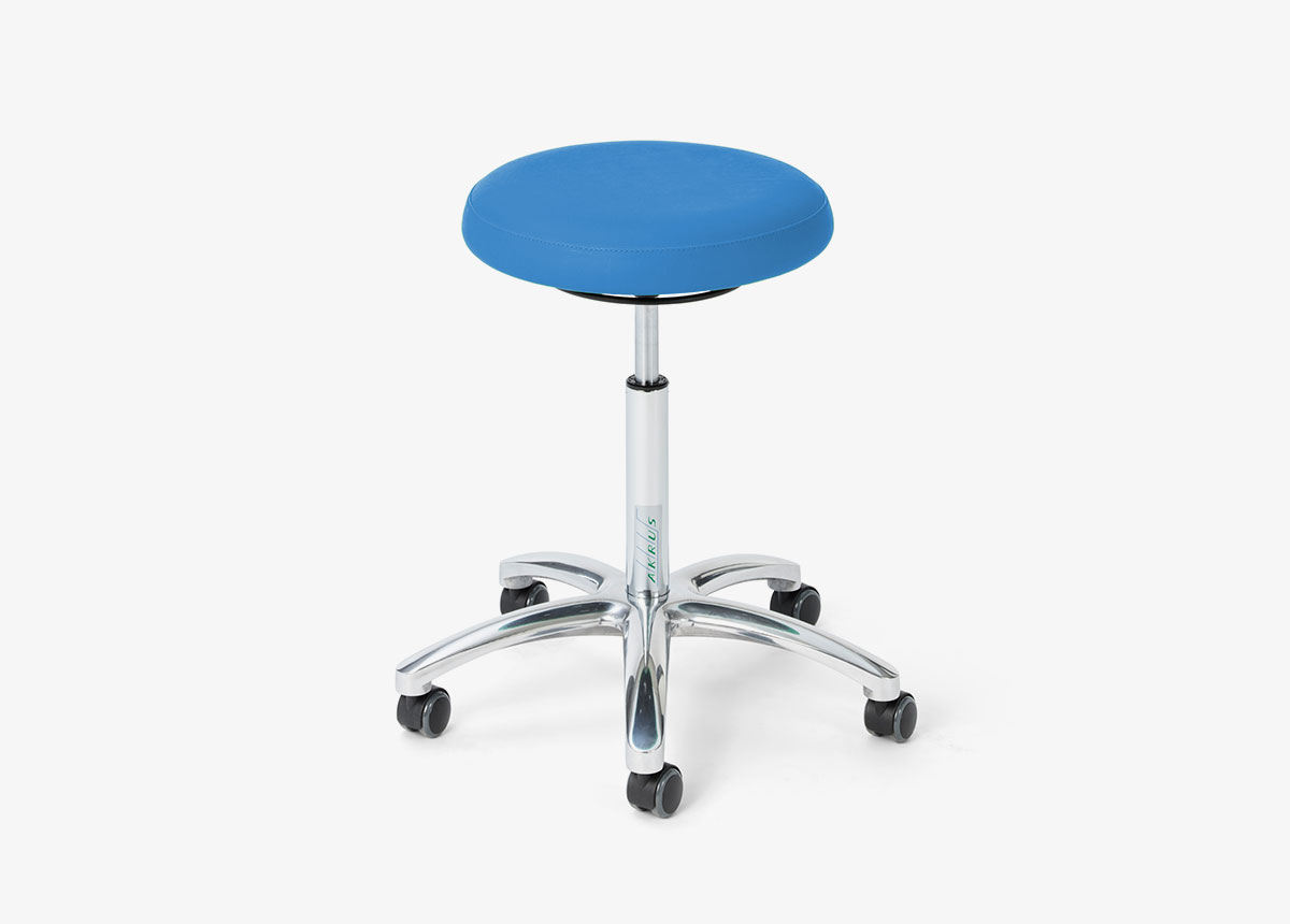 The ak445 is the classic among doctor’s stools. Equipped with a round seat, it can be ordered with or without adjustable armrests and backrest. The sturdy castor base holds five high-quality castors and provides the necessary mobility. The height can be adjusted using a gas pressure spring, which can be ordered with a foot or hand release. Comfortable and flexible armrests can be easily adjusted to the desired position. Horizontally movable armrest holders allow the armrests to be navigated using the elbows.