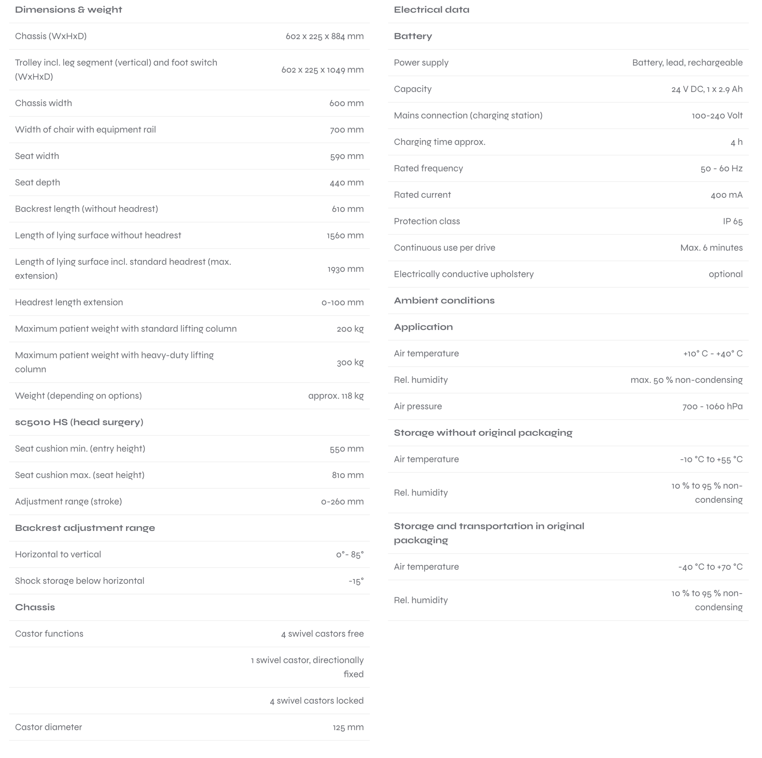 A variante sc5010 HS (Head Surgery) destina-se a tratamentos na região da cabeça. Esta cadeira é utilizada nas seguintes especialidades médicas: ORL (oto-rino-laringologia), cirurgia maxilofacial (boca, maxilar e face), cirurgia plástica, reconstrutiva e estética — principalmente na área da cabeça —, bem como em estimulação nervosa e doação de sangue.