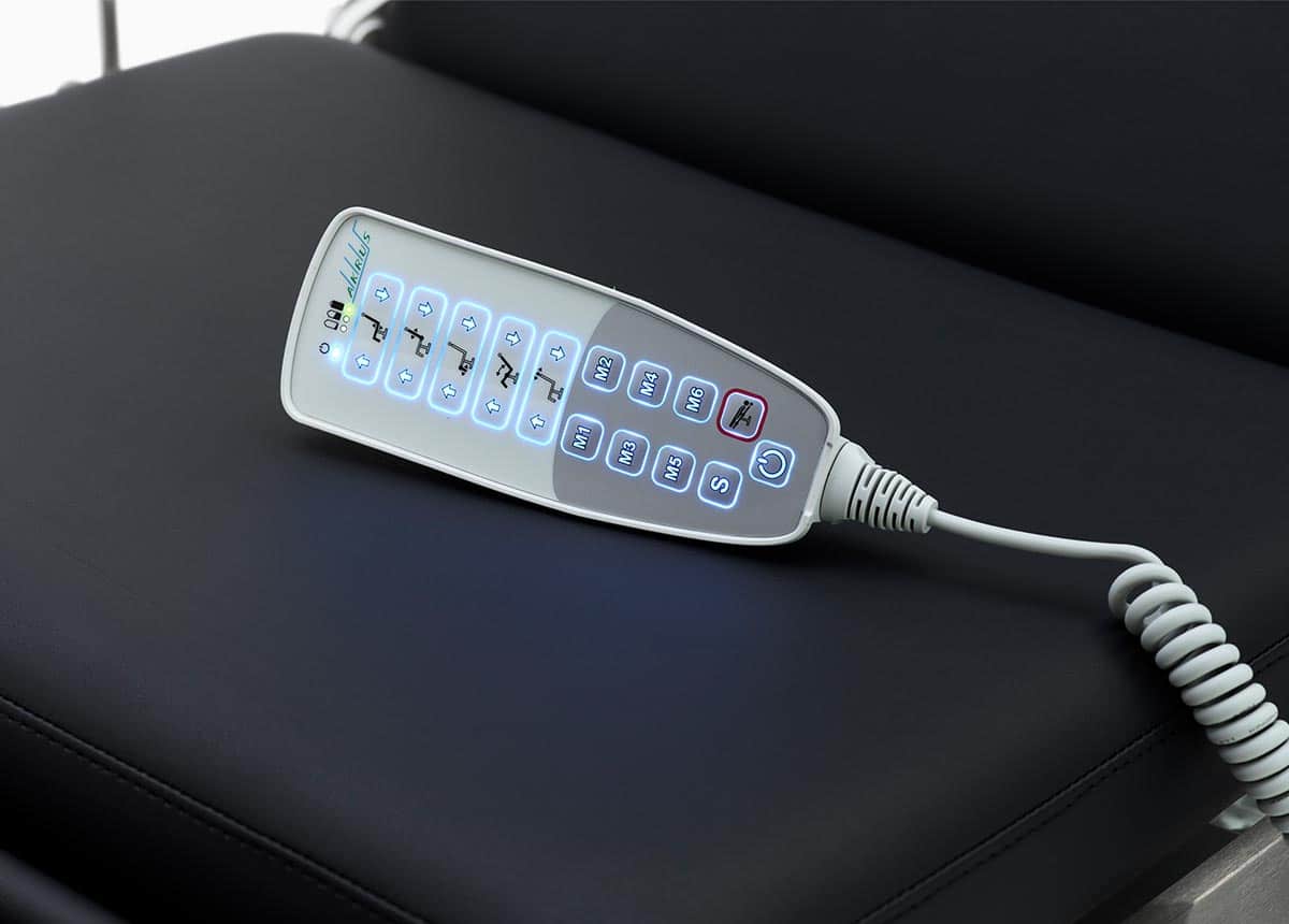 A unidade de controlo, de disposição clara, inclui um botão liga/desliga, indicador de capacidade da bateria e botões para controlar os segmentos motorizados do assento, costas e cabeça. Seis funções de memória facilitam o acesso rápido a configurações repetitivas. Em caso de emergência, a superfície de repouso pode ser colocada na posição de choque com o toque de um botão. O estofamento AKRUS, fabricado segundo os mais elevados padrões de qualidade, garante uma experiência confortável ao sentar e deitar durante o tratamento. Está disponível uma vasta gama de cores e duas espessuras de estofamento. Acessórios compatíveis complementam a funcionalidade da sc5010 SEK. A cadeira cirúrgica móvel sc5010 SEK para grandes articulações é entregue totalmente montada, e o uso de componentes de alta qualidade assegura anos de utilização fiável quando usada conforme as instruções. Em caso de assistência, estão disponíveis revendedores autorizados de tecnologia médica.