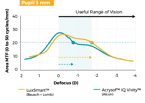 Useful range of vision comparison of experimental Through-focus MTFa and predicted defocus range for LuxSmartTM (Bausch + Lomb) and AcrysofTM IQ VivityTM (Alcon)