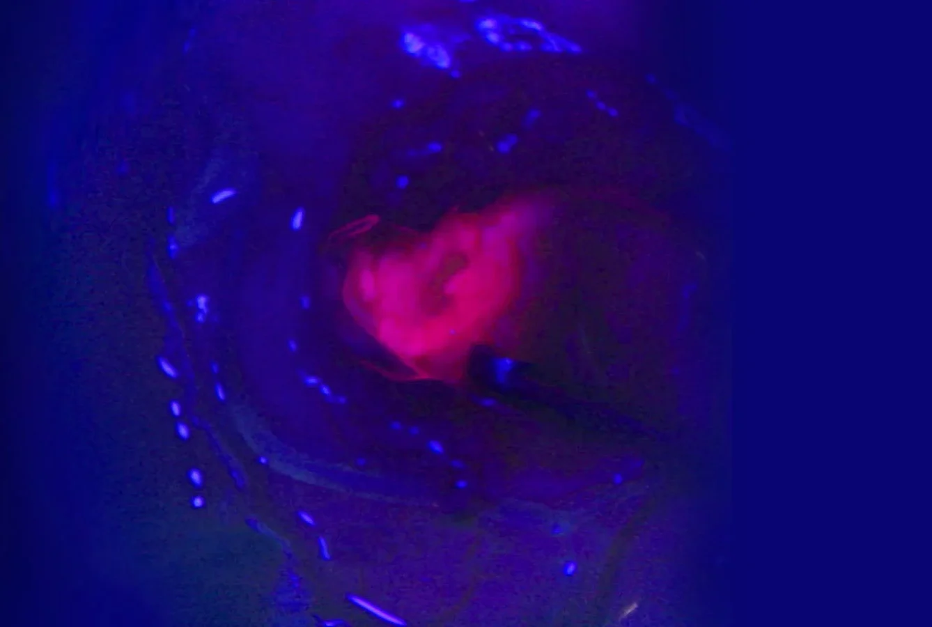 The PPIX in the tumor glows an intense pinkish red, enabling clear differentiation of tumor cells from healthy tissue
