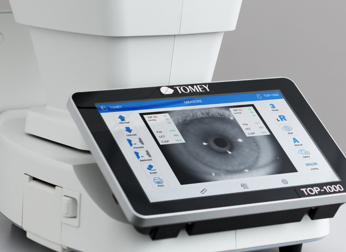 By combining soft air puffing, 3D auto-tracking, and a Scheimpflug camera, TOP-1000 delivers excellent IOP measurements that are corrected for central corneal thickness.